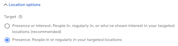 So, you set your campaign to target the city your business is located in. Don’t stop there! Click “Location options” to expand a very important targeting feature.