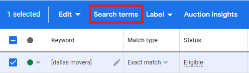 To see what search terms you’re appearing for, select the keyword a to view the search terms report for that specific keyword. (You can also look at this at the ad group level if you want to see search terms for all keywords in an ad group.
