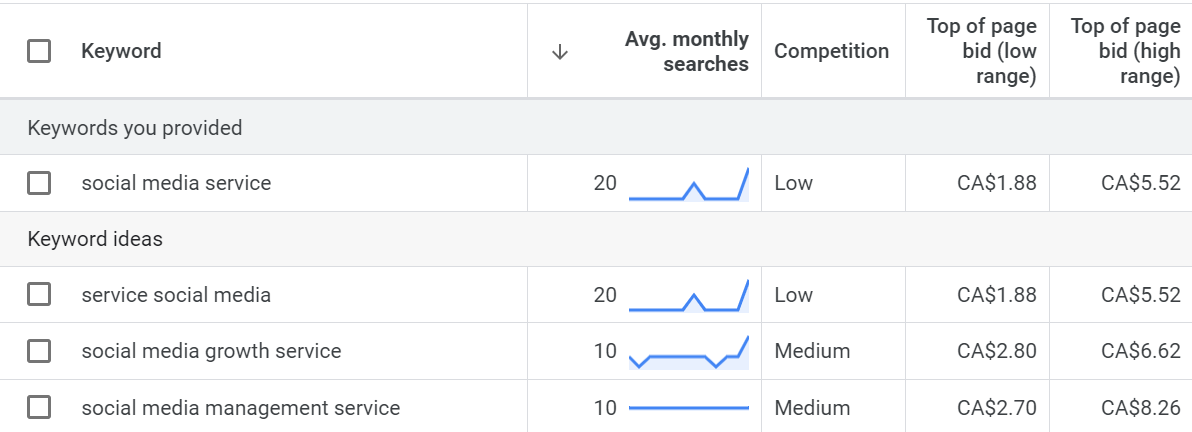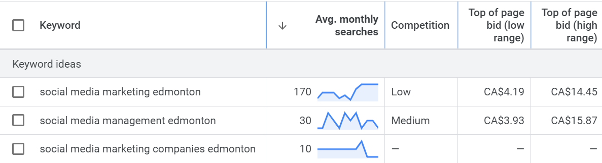 Instead, I can use more specific keywords like “social media service edmonton.” The Keyword Planner shows keyword ideas that are more relevant to my niche.