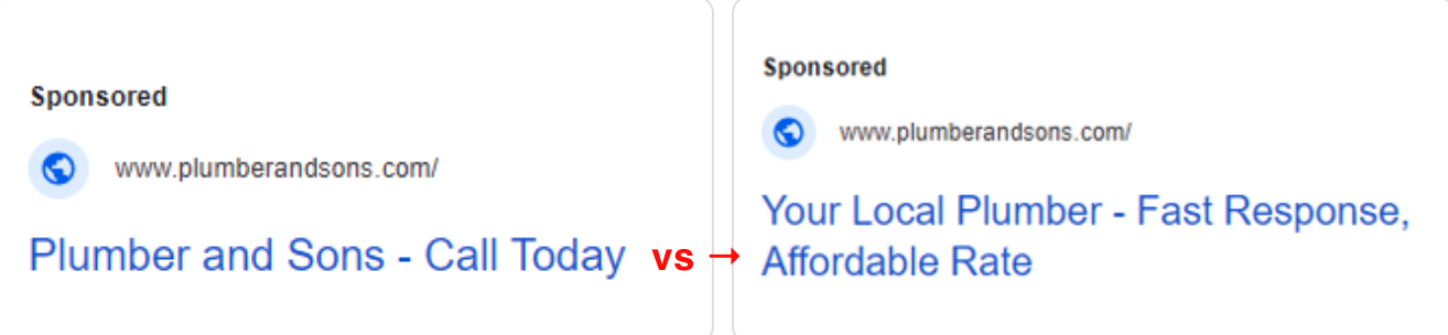 Now that your keywords are organized, you can use them to inspire relevant ad copy. For example, if a user types in “Plumber Near Me,” which ad would they be more compelled to click based on the headlines: