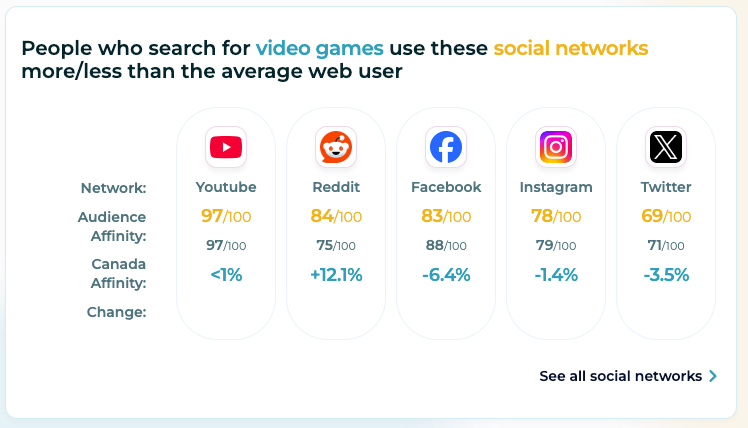 For example, SparkToro can show you the social networks most likely used by users who search for specific queries or topics (see screenshot below).