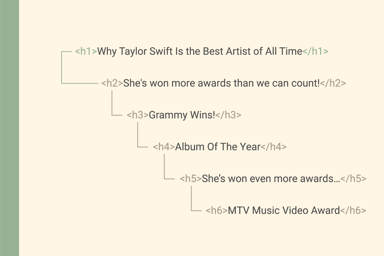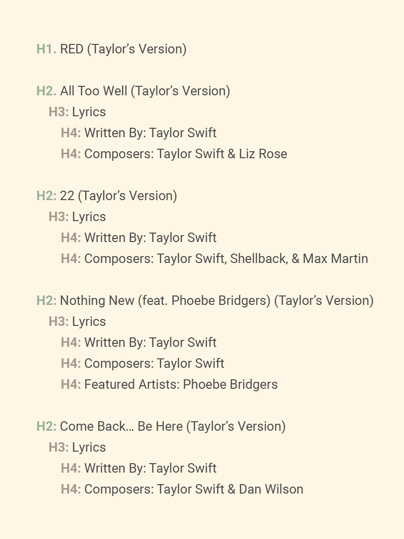 Let’s put heading hierarchy into action with an example (Swifties, this one’s for you). Imagine your webpage is Taylor Swift’s album Red (Taylor’s Version). Here’s how you’d structure it: