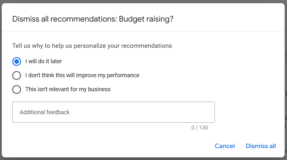 Personally, I browse through them to stay up-to-date with Google’s priorities–but I don’t let them dictate my strategy, especially when many of the recommendations focus on increasing ad spend, which at the end of the day benefits Google.