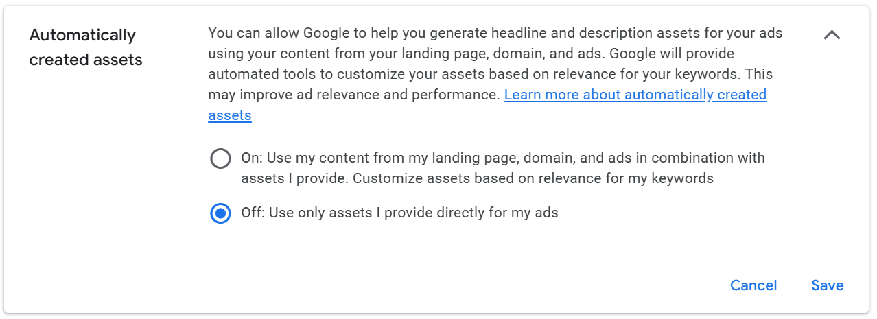 Google’s “automatically created assets” feature generates additional headlines and descriptions for your ads based on your existing content. While it aims to improve ad relevance, it doesn’t always deliver useful results.