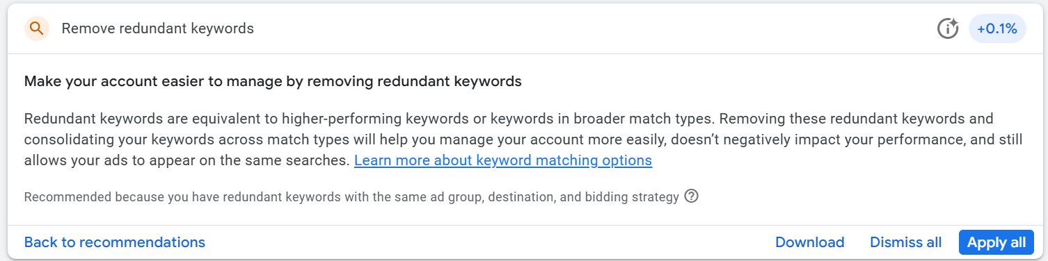 💡 Recommendation: If Google flags keywords as redundant, consider reviewing your campaign’s keyword structure. Splitting keywords into different ad groups based on distinct search intents can help Google better target your audience and will reduce the likelihood of Google marking those keywords as redundant.